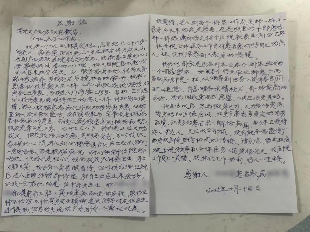 近段时间,我院皮肤一科住院部收到三封手写的表扬信。这些字迹工整甚至略带颤抖的手写信,有来自患者家属的真情流露,也有来自重症患者致谢,字里行间不仅记录着患者康复的喜悦,更是我院作为皮肤病专科医院一直以来秉承“专业治疗”+“人文关怀”的工作理念体现。