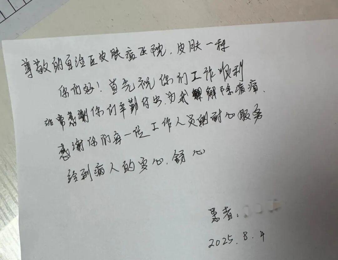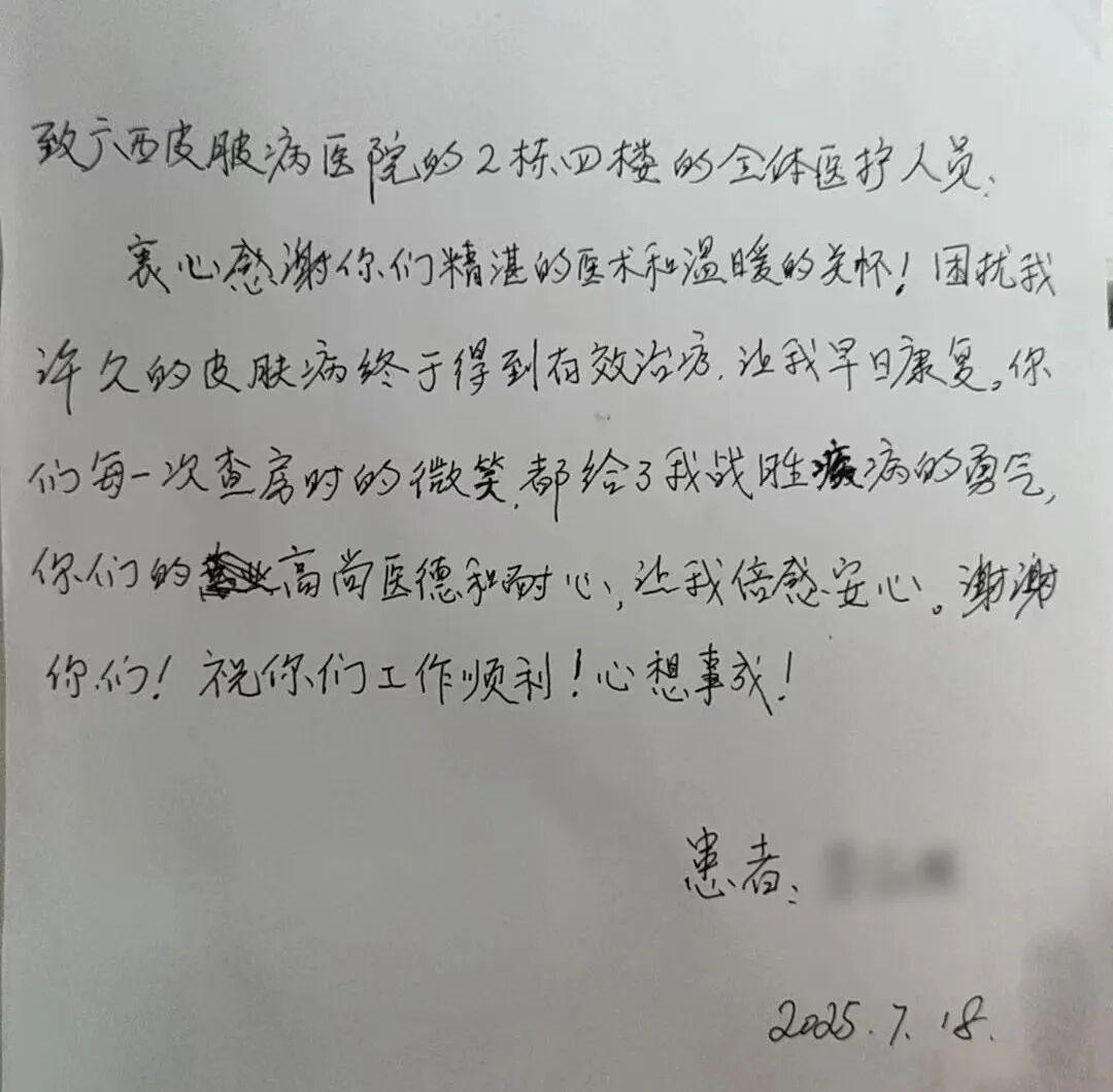 在这里,专业是强专科的业务能力,而仁心则是抚慰患者因病受伤的心——三封感谢信的故事未完待续,更多关于信任与治愈的篇章,正由每一位皮防医护人员继续书写。